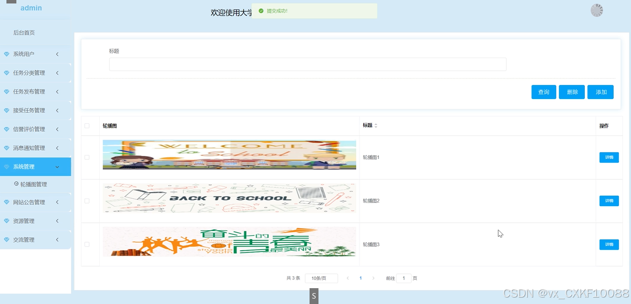系统管理(轮播图):管理员可以管理系统首页的轮播图内容和显示顺序,包括添加、删除、修改轮播图等操作。