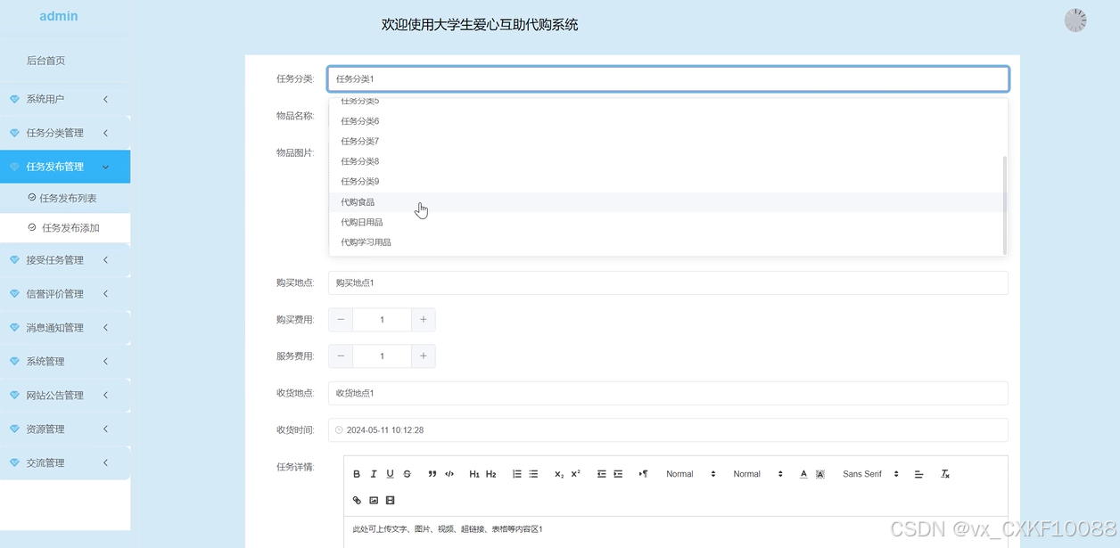 任务发布:用户可以发布自己的代购任务需求信息。