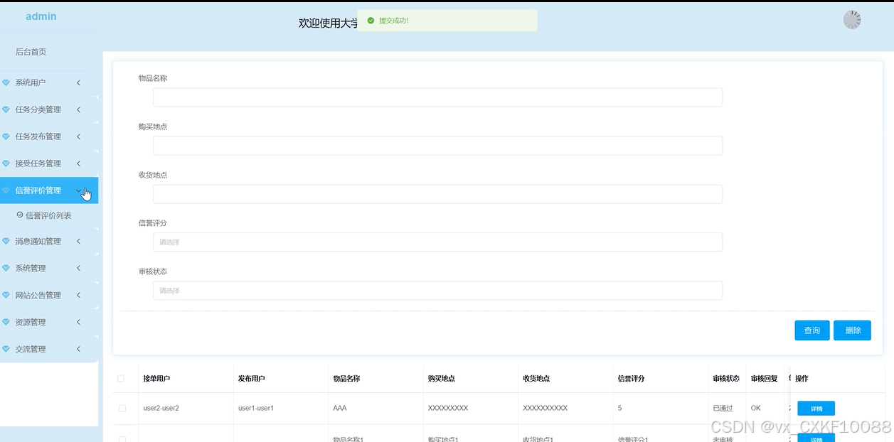 信誉评价管理:管理员可以管理用户的信誉评价,包括查看用户评价、处理投诉等。
