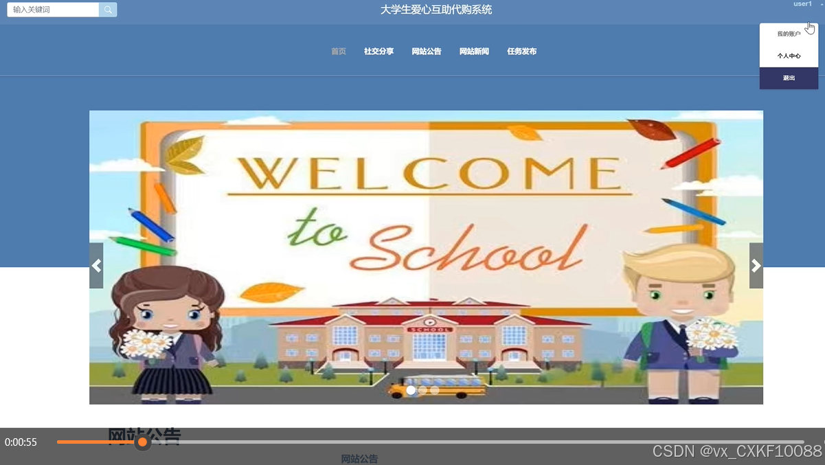 首页:用户登录后可以看到网站公告、网站新闻等系统发布的信息。