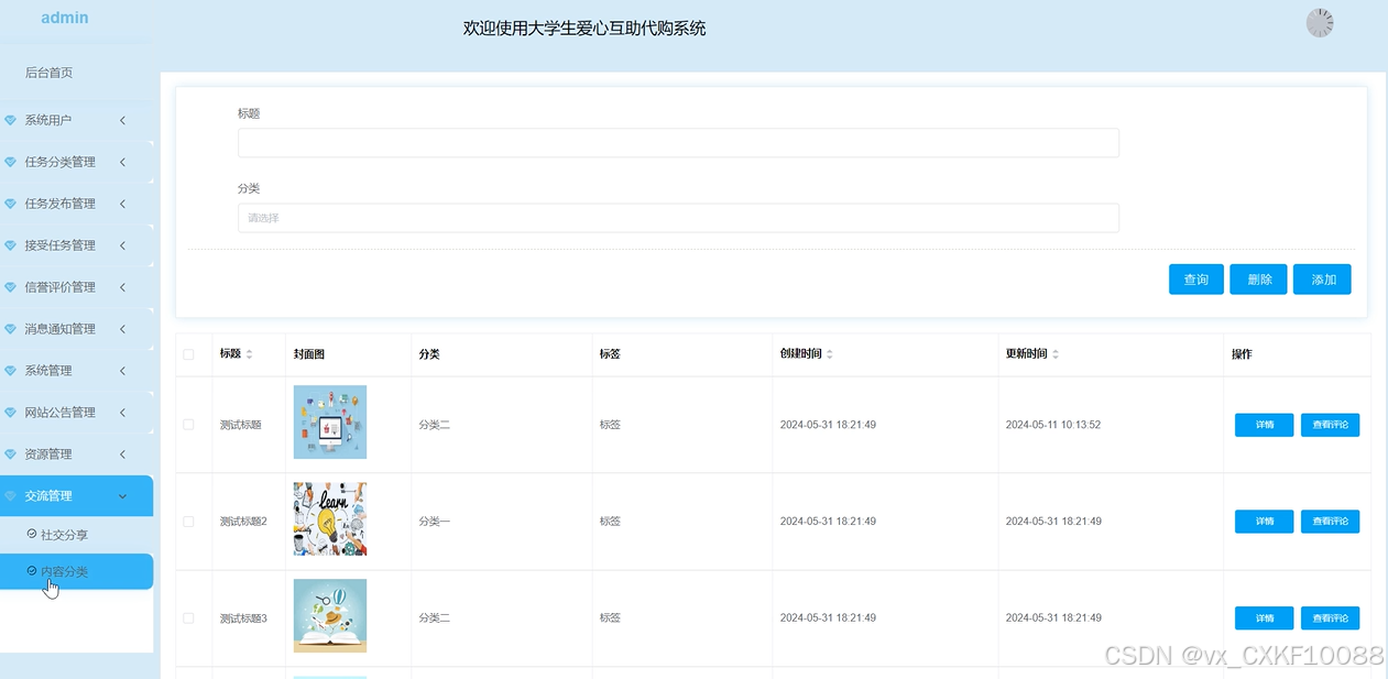 交流管理:管理员可以管理用户之间的社交分享内容和分类,包括监督不良信息、管理分类等操作。