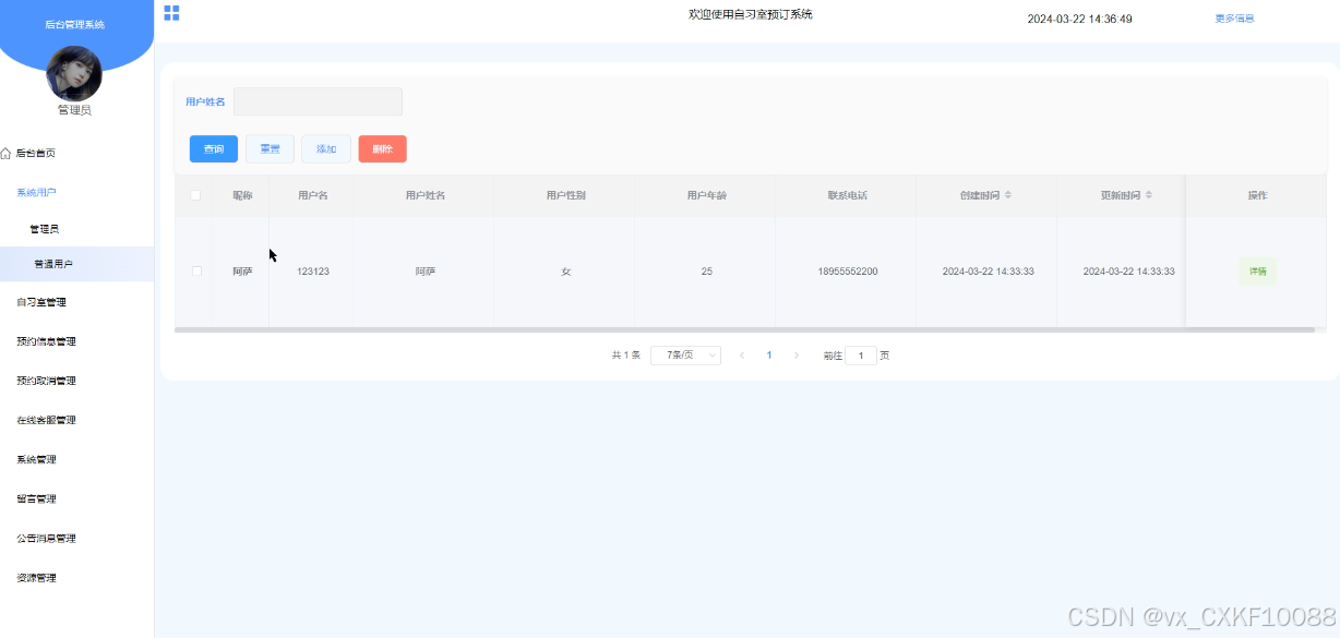 (2)系统用户:管理员可以对自习室预订系统中的管理员和普通用户账户信息进行增删改查。