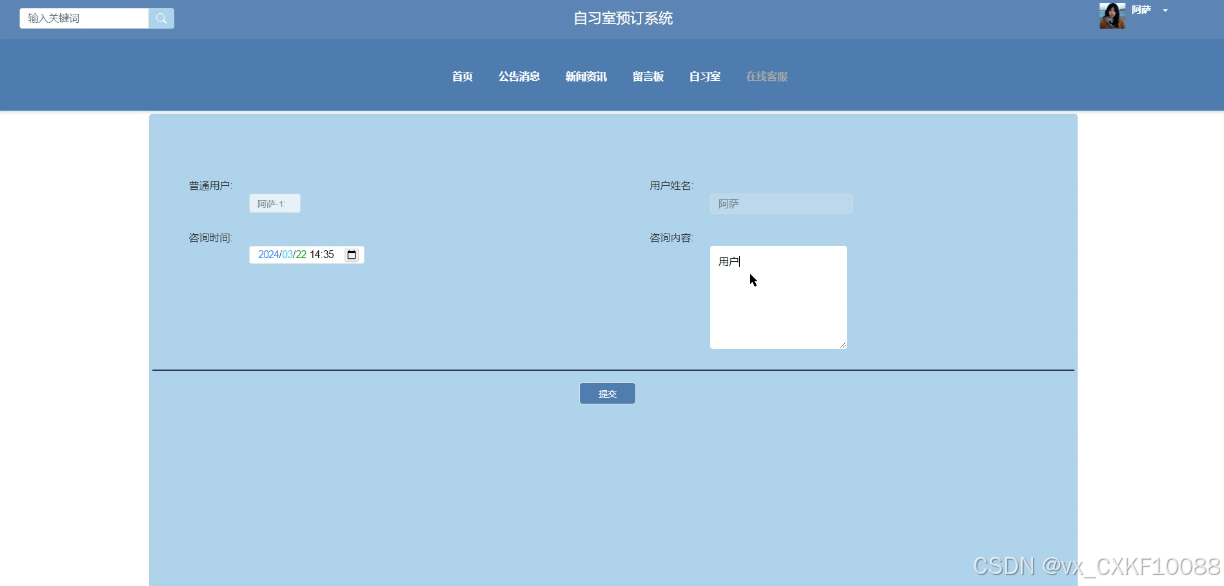 当访客点击自习室预订系统中导航栏上的“在线客服”后将会进入到在线客服咨询内容填写页面,根据系统提示输入普通用户、用户姓名、咨询时间、咨询内容等信息。在线客服界面如下图5-8所示。