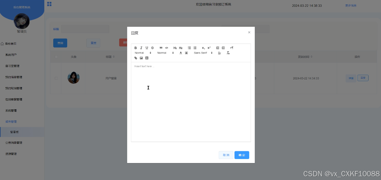 (4)预约信息管理:主要查看前台用户自习室的预约信息并进行审核回复操作。
