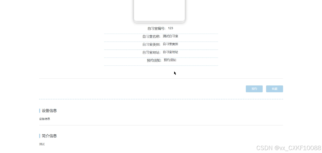 正式通过注册的用户可以点击自习室菜单,在此页面查看自习室详细信息,包括自习室编号、自习室名称、自习室类别、自习室地址、设备信息、简介信息等,点击“预约”进入到预约信息填写页面。自习室详情展示界面如下图5-7所示。