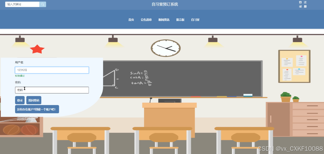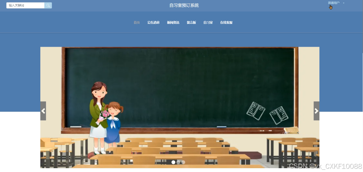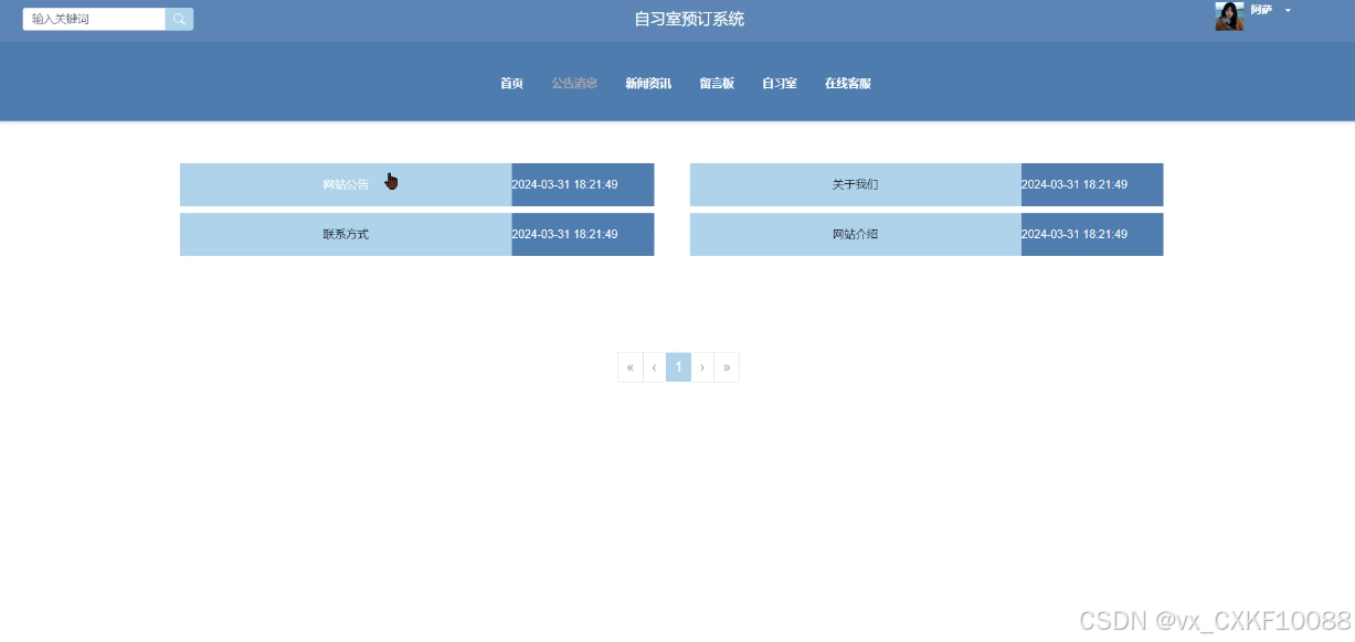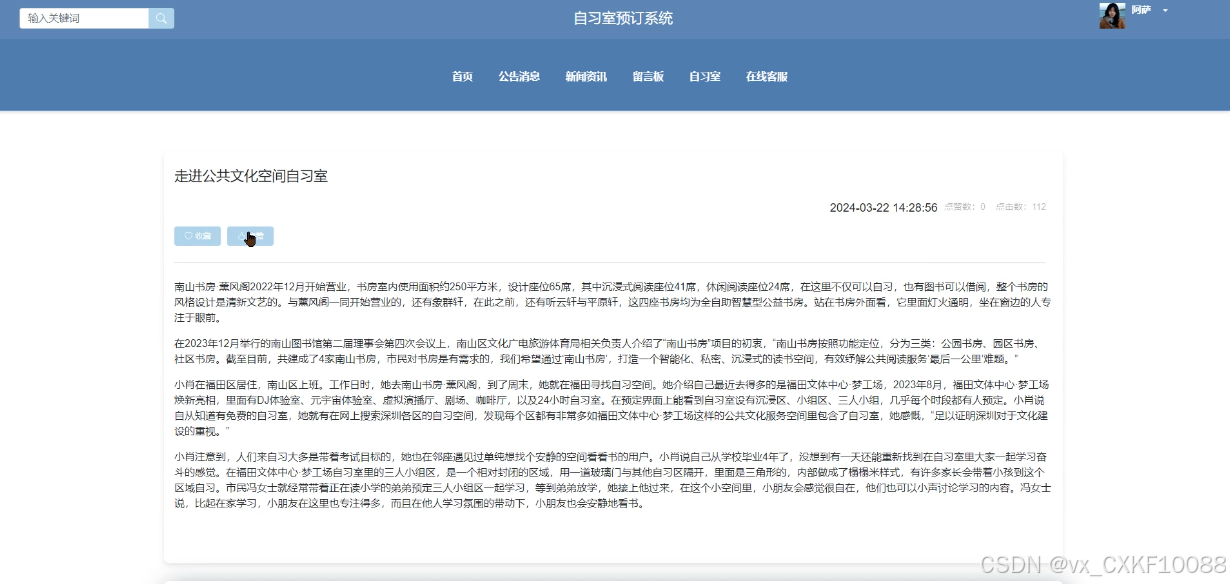 (2)查看自习室预订系统的首页信息:自习室预订系统的首页信息包含了首页、公告消息、新闻资讯、留言板、自习室、在线客服等。
