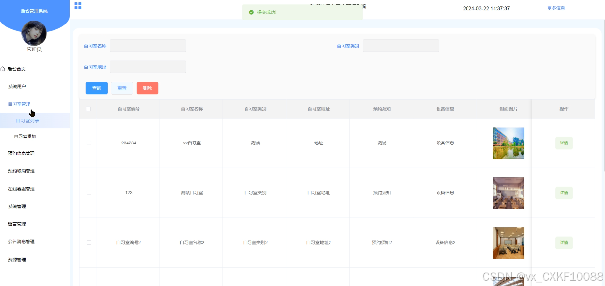 (3)自习室管理:管理员点击“自习室管理”会显示出所有的自习室,支持输入自习室名称对自习室进行查询,如果想要添加新的自习室信息,点击“添加”按钮,输入详细信息,点击“提交”按钮就可以添加了,同时可以选择某一条自习室,点击“删除”进行删除。也可以对用户提交的自习室评论的信息进行管控。