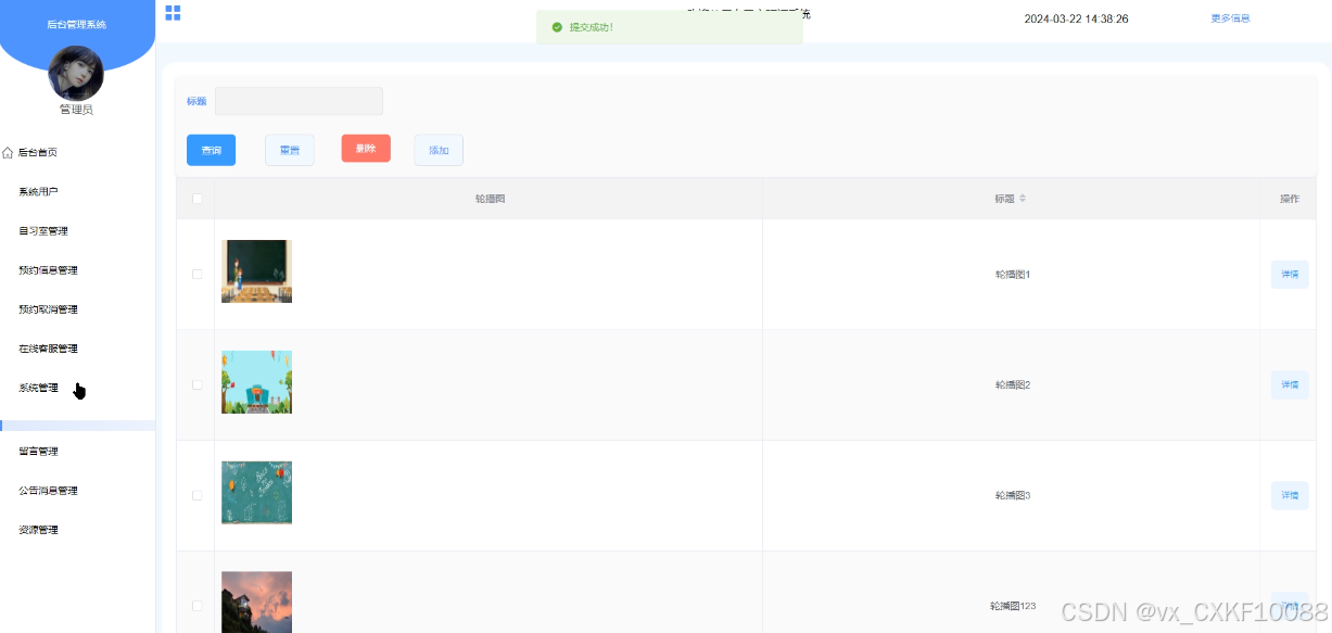 (7)系统管理:管理员点击“系统管理”菜单可以对首页展示的轮播图进行管理。
