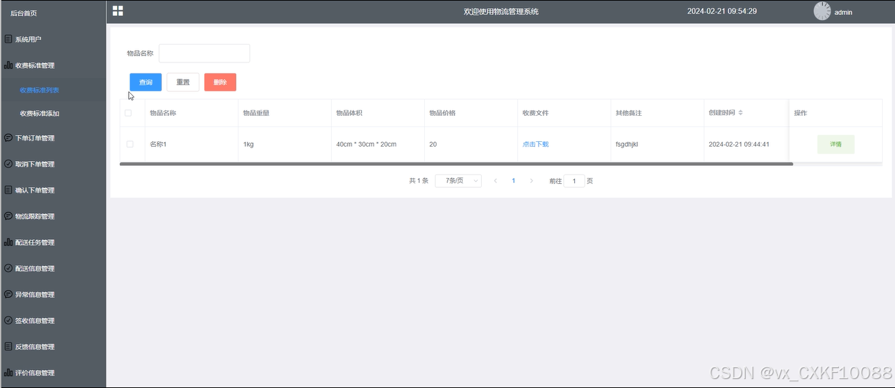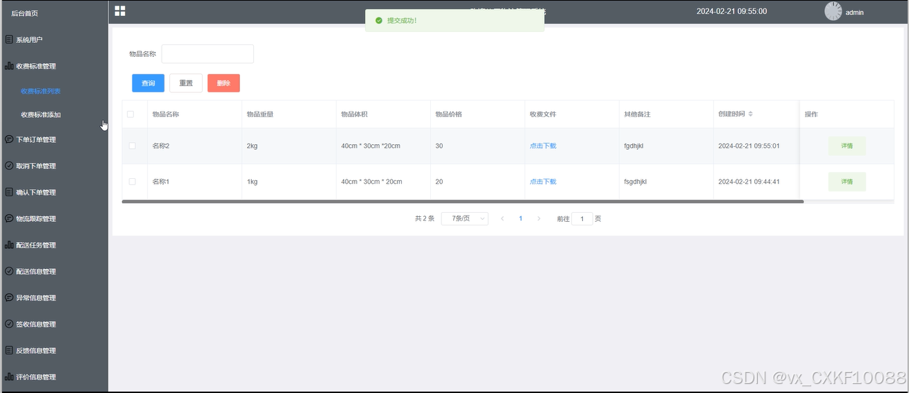 收费标准管理:管理员对收费标准列表、添加进行详情查看和添加新增的收费标准内容,并根据需求进行增删改查。