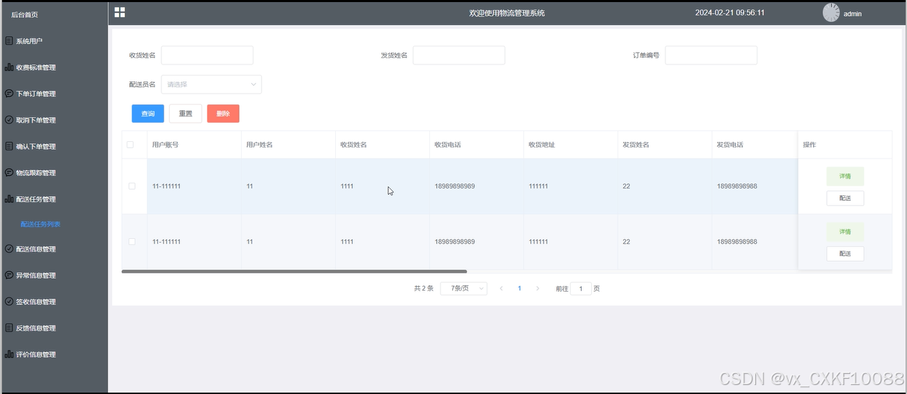 配送任务管理:配送员对配送任务列表进行详情查看,并根据需求进行查询、重置、删除等管控。