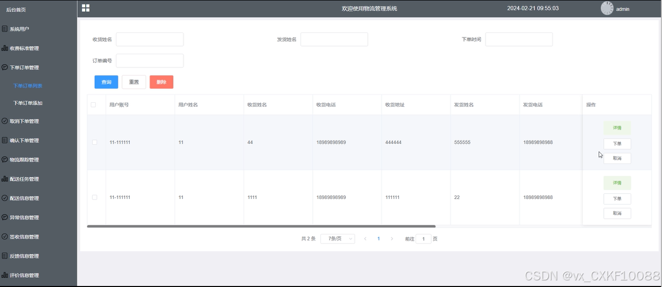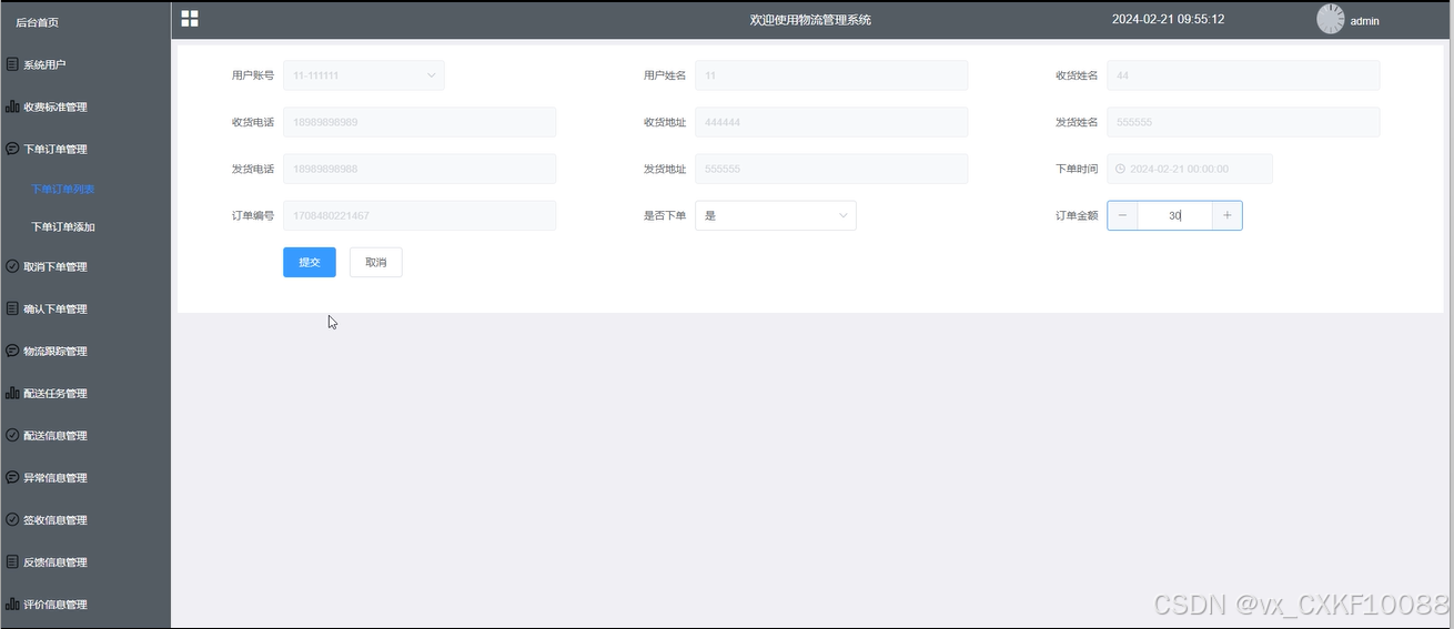 下单订单管理:管理员对下单订单管理列表、添加进行详情查看和添加新增的下单订单内容,可以编辑确认下单和取消下单进行管控,并根据需求进行增删改查。