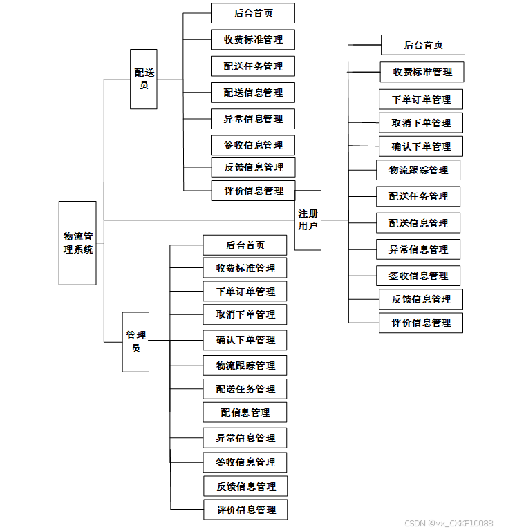 物流管理系统的功能主要分为注册用户、配送员根据自己的需求进行注册登录,提交订单申请操作。后台系统管理员主要对首页、系统用户(管理员、注册用户、配送用户)、收费标准管理、下单订单管理、取消下单管理、确认下单管理、物流跟踪管理、配送任务管理、配送信息管理、异常信息管理、签收信息管理、反馈信息管理、评价信息管理处理。