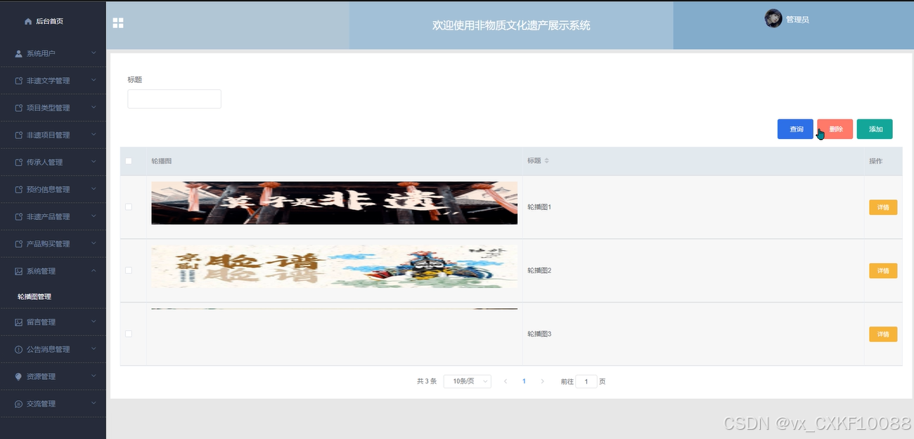 (10)系统管理:在系统管理中,管理员负责轮播图的管理。他们可以查询轮播图信息、删除不再需要的轮播图、添加新的轮播图,并查看轮播图的详情。同时,管理员还支持通过标题进行搜索,以快速找到特定的轮播图。