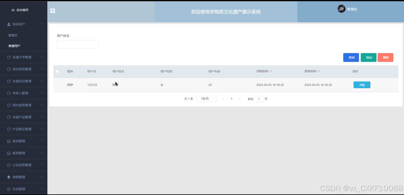 (6)传承人管理:在传承人管理中,管理员可以列出所有传承人的信息,包括姓名、传承项目等。当新的传承人加入时,管理员会负责录入相关信息。查看传承人的详情和评论也是其职责之一。通过关键词查询功能,管理员可以快速找到特定的传承人。对于不再需要的传承人信息,管理员可以进行删除操作。同时,管理员还支持通过人物姓名和传承项目进行搜索,以快速定位到相关传承人。