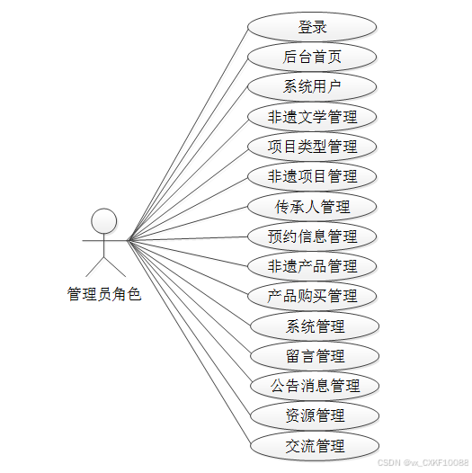 管理员则可以通过系统管理各项内容,包括非遗文学作品的编辑与展示、项目类型的分类管理、传承人信息的更新与管理、预约信息的监督与安排、非遗产品的库存管理和销售、系统设置的调整与优化、留言的审核与回复、公告消息的发布与管理、资源的上传与分享,以及用户之间的交流和互动。这些管理功能有助于维护系统的运行和用户体验,保障系统的正常运行和信息的准确性。