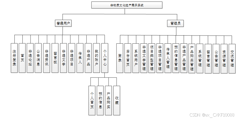 按照非物质文化遗产展示系统的角色,我划分为了普通用户模块和管理员模块这两大部分。