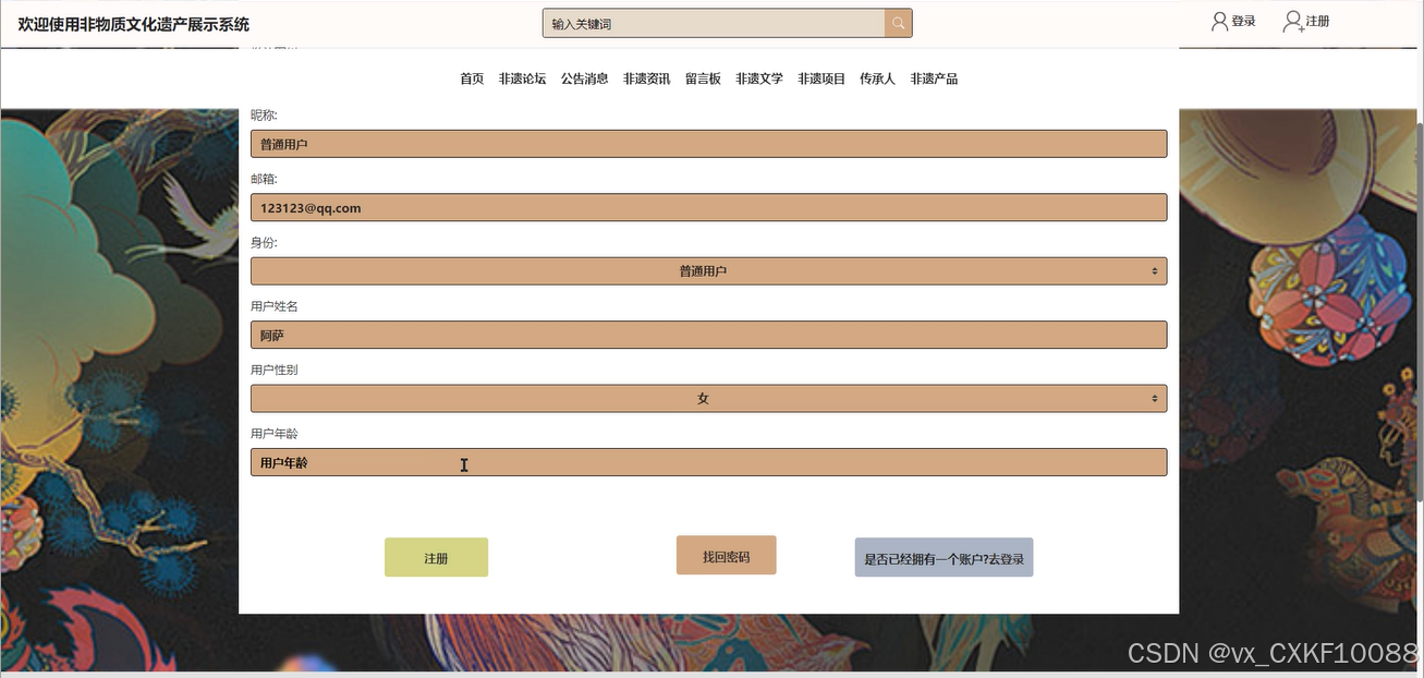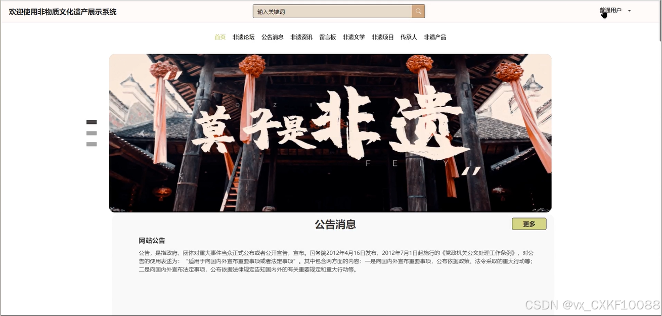 关键词:非物质文化遗产、展示系统、SpringBoot框架