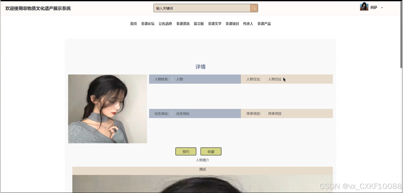 (9)传承人:在此模块,用户可以查看非遗传承人的列表详情,包括人物姓名、传承项目等。用户可以通过人物姓名、传承项目进行搜索,找到心仪的传承人。对于喜欢的传承人项目,用户可以进行收藏和预约,并发表评论。