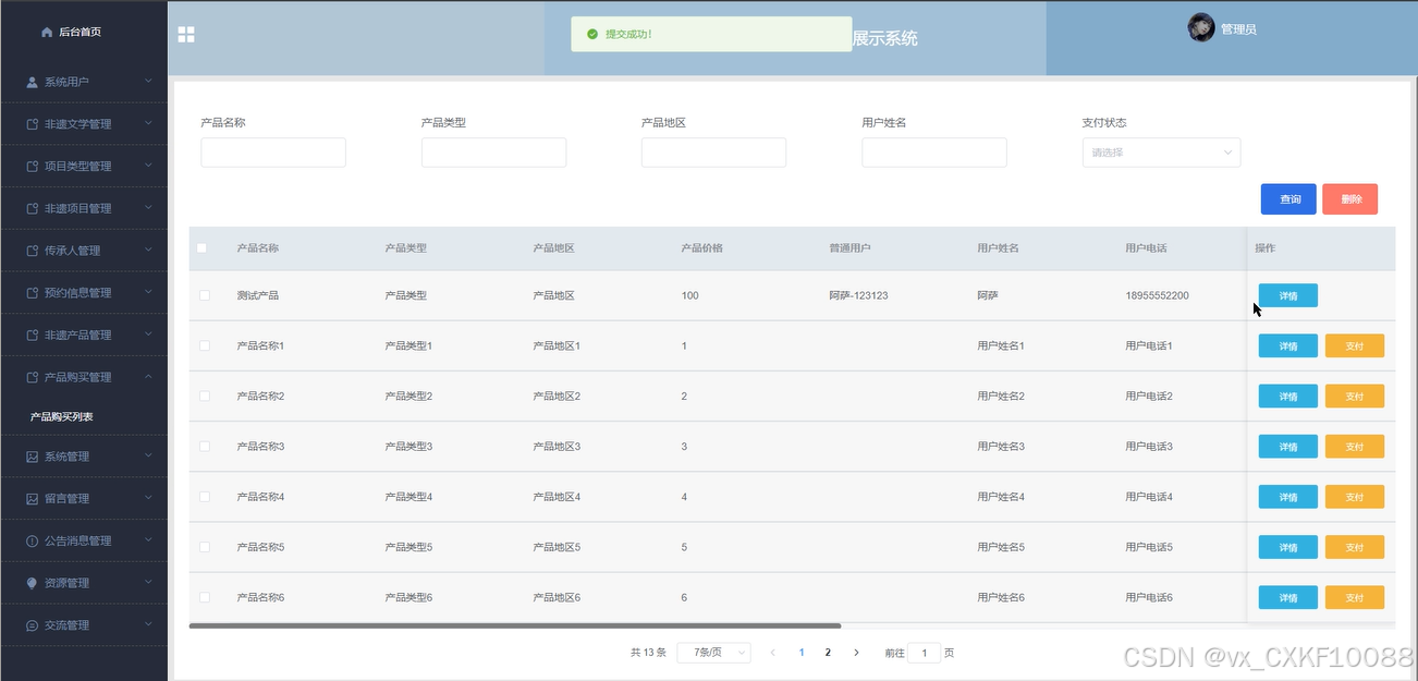 (9)产品购买管理:在产品购买管理中,管理员可以查看所有产品购买记录的列表,包括购买用户、产品信息等。查看购买详情和用户支付订单详情也是其职责之一。当需要删除购买记录时,管理员可以进行相应的操作。此外,管理员还支持通过产品名称、产品类型、产品地区、用户姓名、支付状态进行搜索,以满足特定的查询需求。
