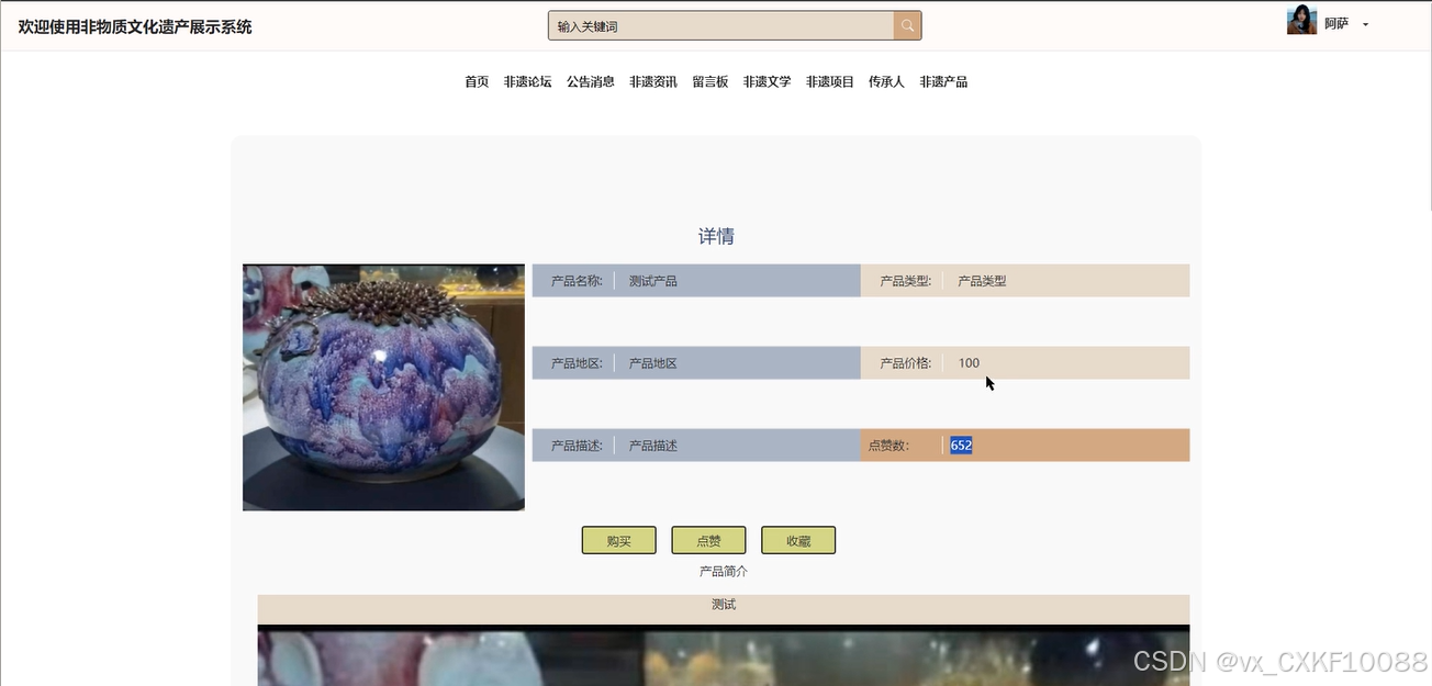 (10)非遗产品:普通用户可以在此模块查看非遗产品的列表,包括产品名称、产品类型、产品地区等信息。用户还可以通过产品名称、产品类型和产品地区进行搜索,找到心仪的产品。对于喜欢的非遗产品,用户可以点赞、收藏,甚至在线购买,并发表评论分享自己的使用感受。