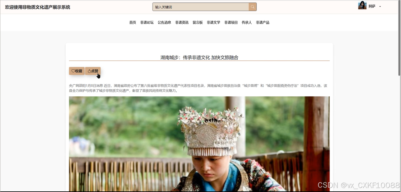 (5)非遗资讯:用户可以在此模块浏览各类非遗资讯,了解非遗文化的各个方面。对于感兴趣的资讯,用户可以点赞、收藏,并发表自己的评论,与其他用户交流心得。