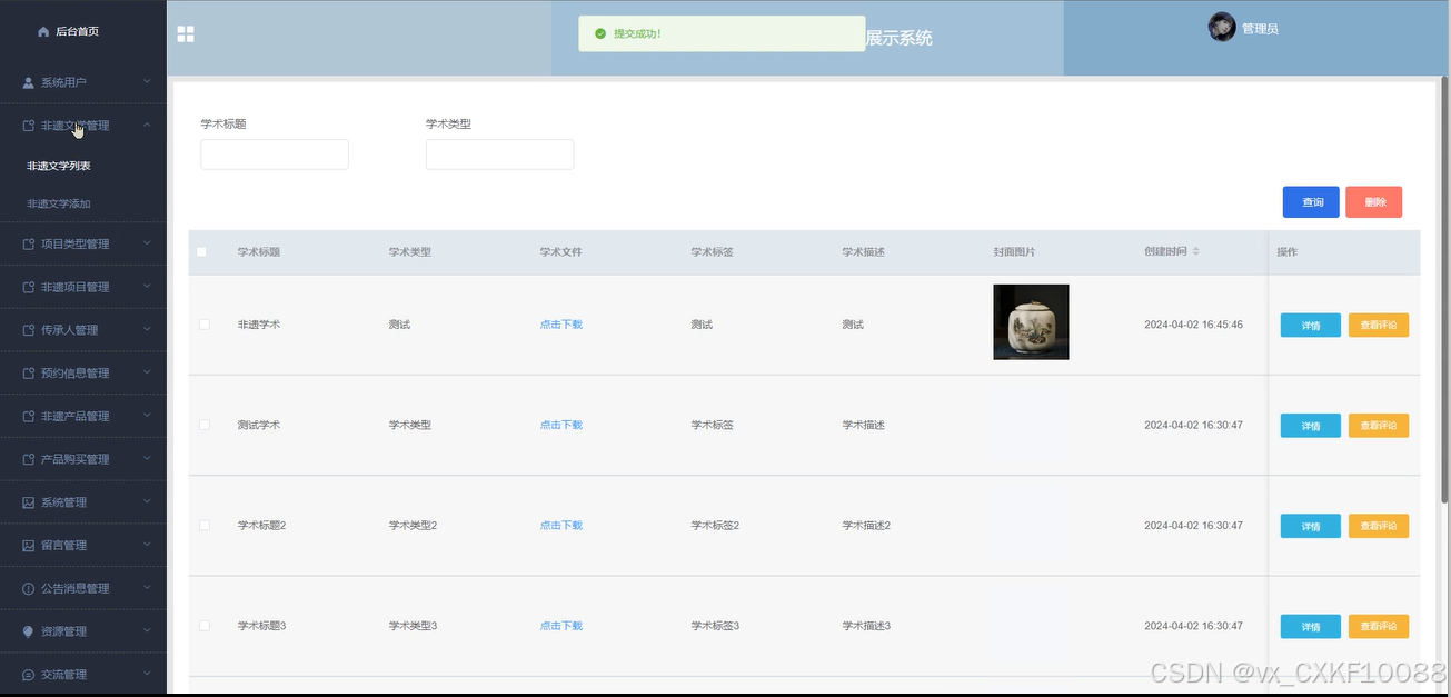 (3)非遗文学管理:管理员在非遗文学管理中具备全面的功能,可以清晰地列出所有非遗文学作品,包括标题、作者和简介。当需要添加新作品时,管理员可以轻松添加并填写详细信息。同时,查看作品详情和评论也是其职责之一,确保内容准确无误。通过关键词查询,管理员可以迅速找到特定作品。对于不再需要的作品,管理员有权进行删除操作。此外,管理员还支持通过学术标题和学术类型进行高级搜索,以满足特定的查询需求。对于关联学术文件的作品,用户还可以点击下载。