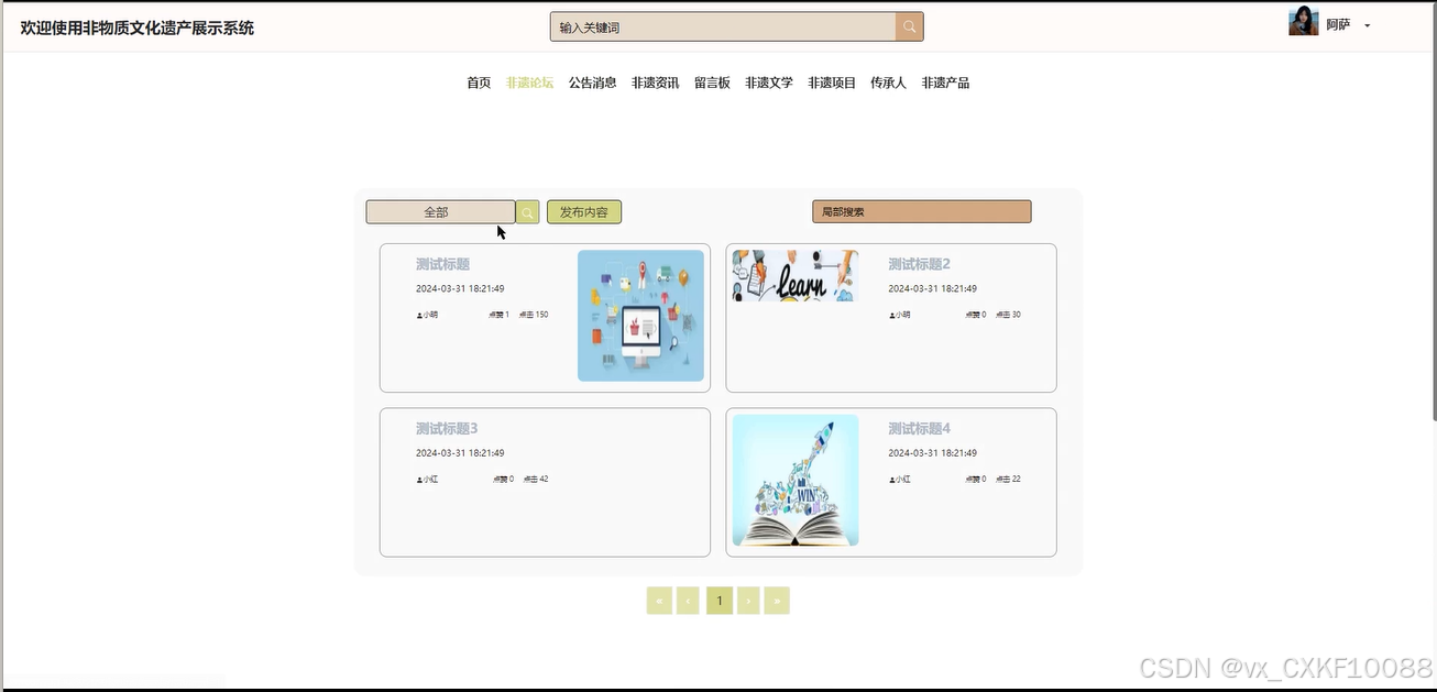 (3)非遗论坛:普通用户在非遗论坛前台可以浏览论坛内容,了解其他用户对于非遗话题的讨论和见解。同时,用户也可以自己发布内容,分享对非遗的理解和感悟,参与论坛的互动。