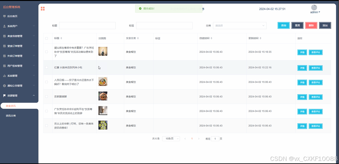 | 测试流程 | 1)管理员点击资源管理,点击美食资讯,点击添加后并填写信息。 2)点击进行提交。 |