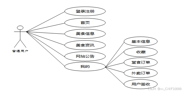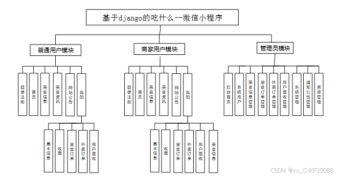 按照基于django的吃什么--微信小程序的角色,系统划分为了普通用户模块、商家用户模块和管理员模块这三大部分。在设计和实现基于Django的吃什么--微信小程序时,我们需要充分考虑普通用户、商家用户和管理员的不同需求,以确保系统能够满足各类用户的功能要求。以下是针对不同用户角色的功能分析: