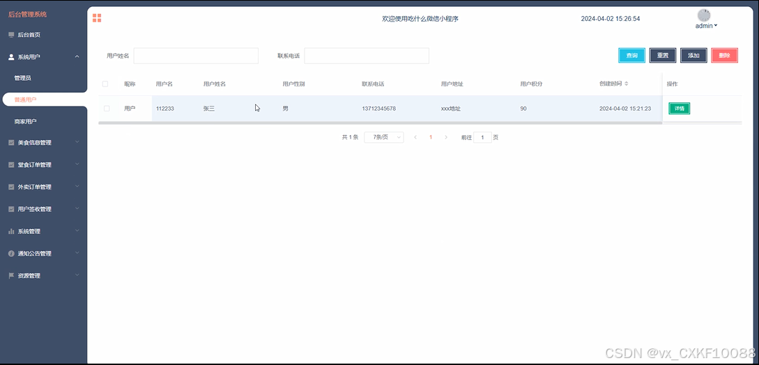 基于django的吃什么--微信小程序中的管理人员是可以对注册的普通用户、商家用户进行管理的,也可以对管理员进行管控。界面如下图4-13所示。