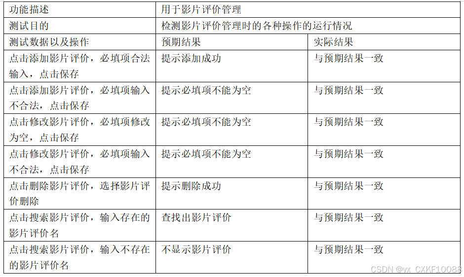 下表是影片评价管理功能的测试用例,检测了影片评价管理中对影片评价信息的增加,删除,修改,查询操作是否成功运行。观察系统的响应情况,得出该功能也达到了设计目标,系统运行正确。