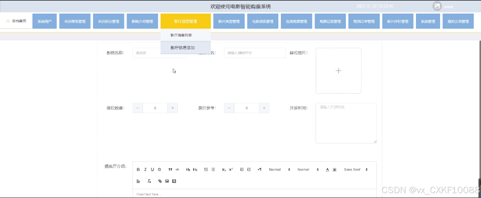 (3)影厅信息管理:管理员可以对影厅信息进行维护,包括添加新的影厅、删除不需要的影厅、修改影厅的营业时间等。
