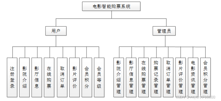 凉都影城智能购票系统总体分为前台用户模块和后台管理员模块。