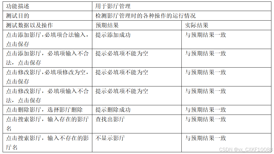 下表是影厅管理功能的测试用例,检测了影厅管理中对影厅信息的增加,删除,修改,查询操作是否成功运行。观察系统的响应情况,得出该功能也达到了设计目标,系统运行正确。