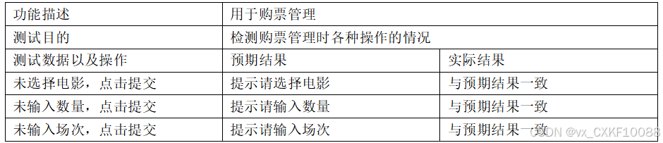 下表是购票管理功能的测试用例,检测了购票管理中购票单的操作是否成功运行。观察系统的响应情况,得出该功能也达到了设计目标,系统运行正确。