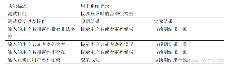 下表是系统登录功能测试用例,检测了用户名和密码的不同的输入情况,观察系统的响应情况。得出该功能达到了设计目标。