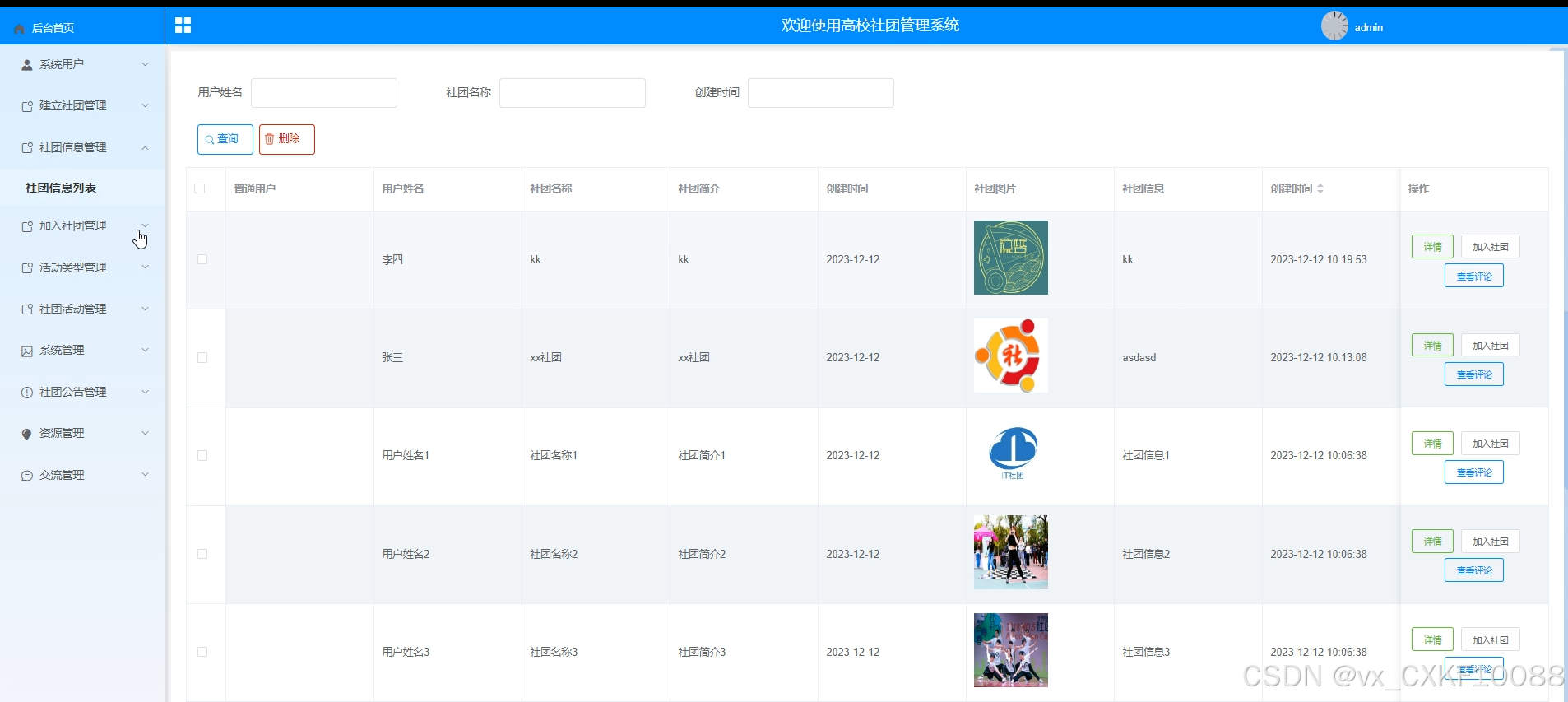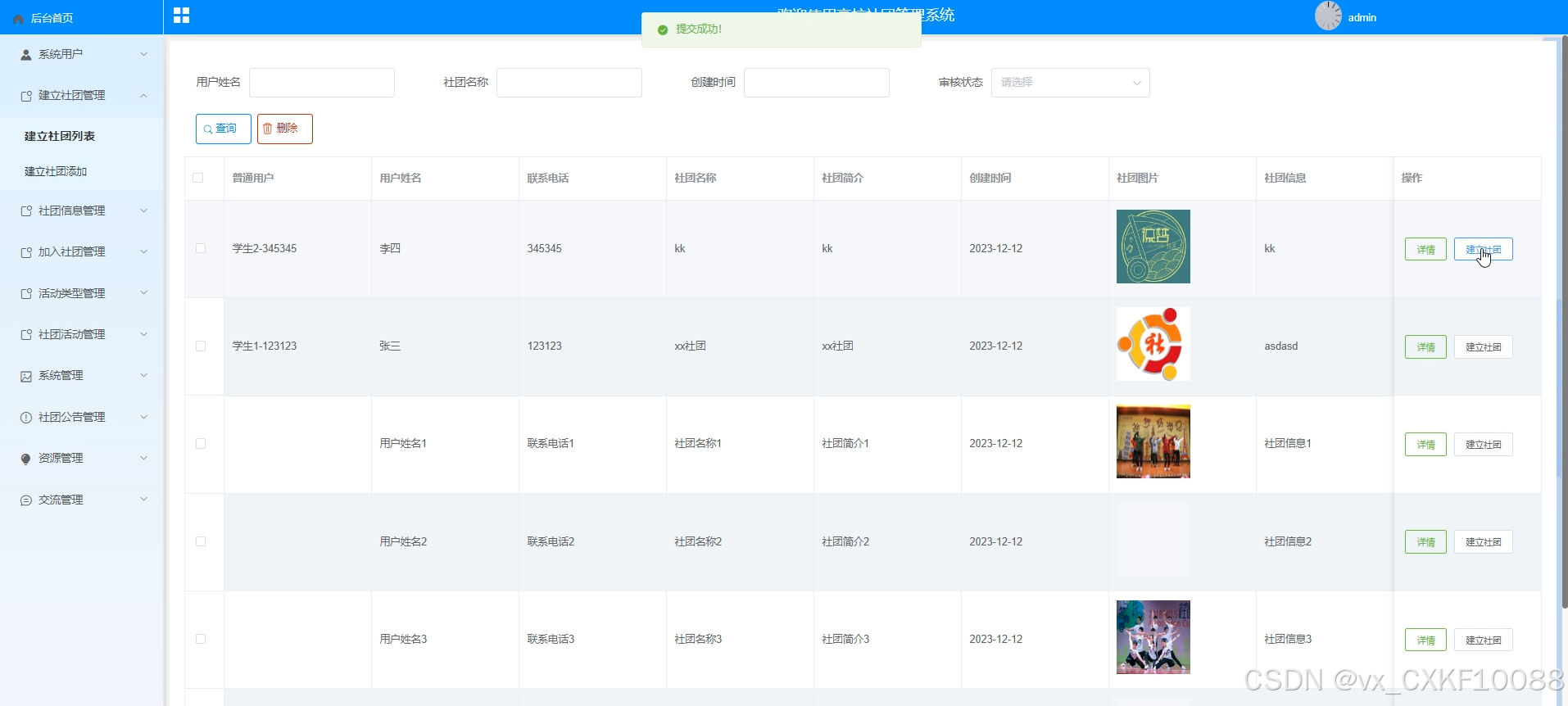 (2)建立社团管理:管理员可以对系统建立社团进行增删改查。