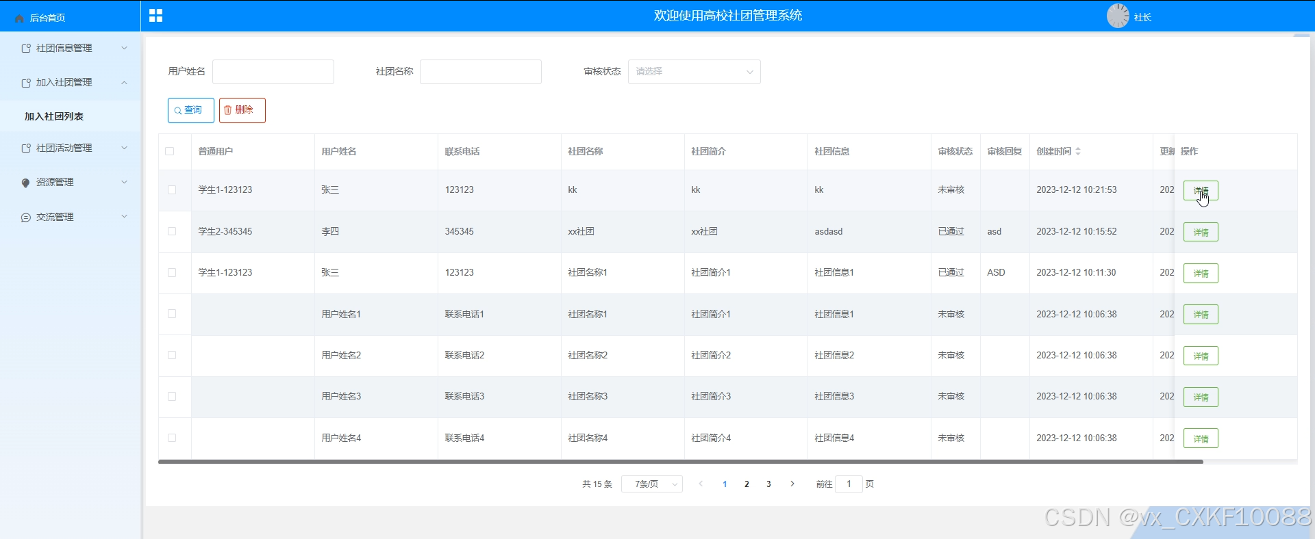 (2)加入社团:社长点击“加入社团”这一菜单,能够查看到前台用户提交的加入社团信息,可以对加入社团信息进行审核。