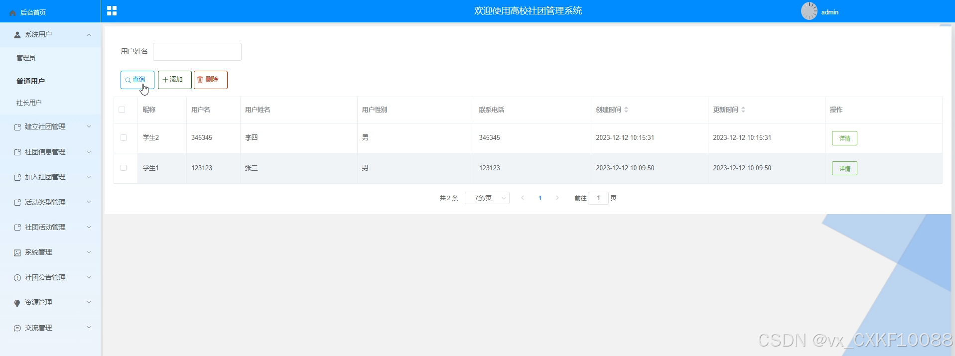 管理员可以对高校社团管理系统中的管理员,社长以及前台注册的学生用户进行增删改查。界面如下图4-12所示。