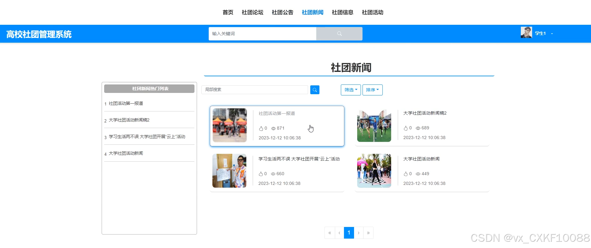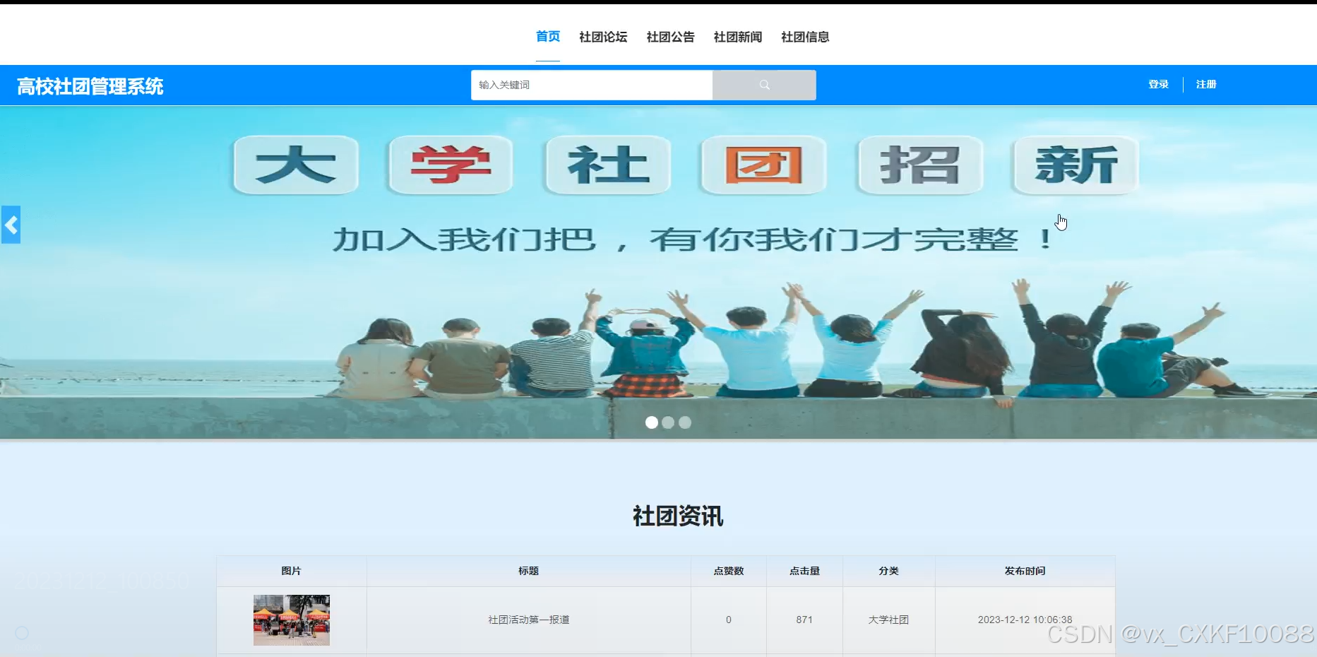 (2)查看高校社团管理系统的首页信息:高校社团管理系统的首页信息包含了首页、社团论坛、社团公告、社团新闻、社团信息、个人中心(首页、建立社团、加入社团、社团活动、收藏)等。