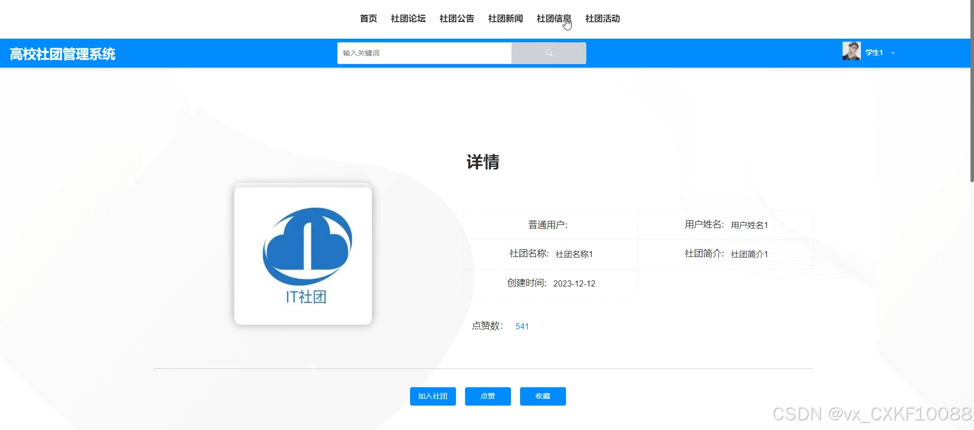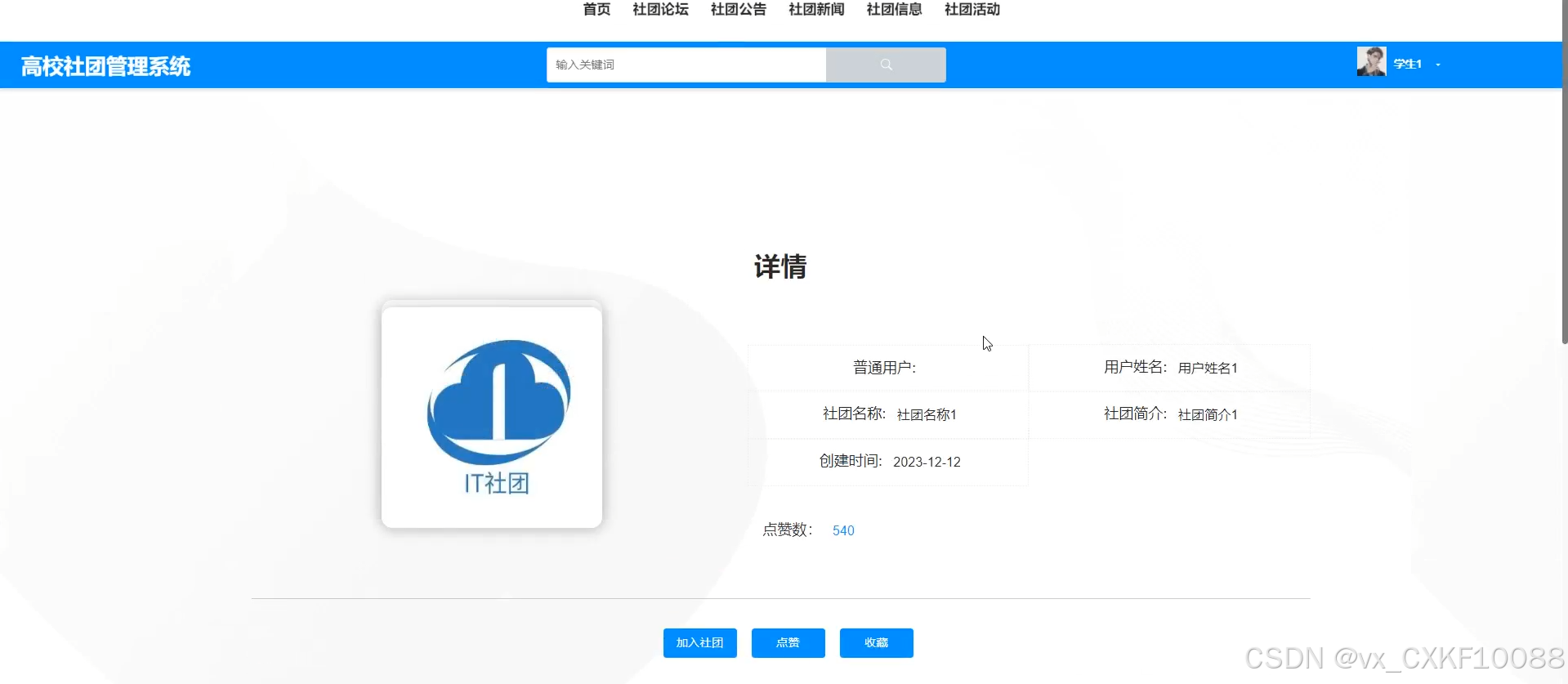 用户点击“社团信息”这个菜单按钮,就会显示所有的社团信息列表,在查询到自己想要加入社团的时候,可以进入查看详细的介绍,在这个界面,也可以对社团进行加入、点赞、收藏、评论操作,社团信息详情展示页面如图4-6所示。