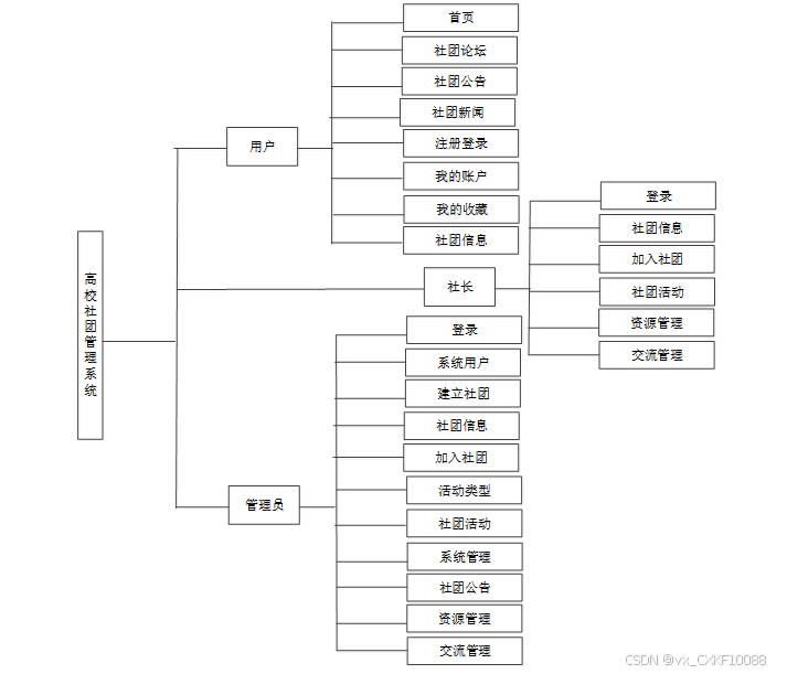按照高校社团管理系统的角色,我划分为了学生模块,社长模块和管理员模块这三大部分。