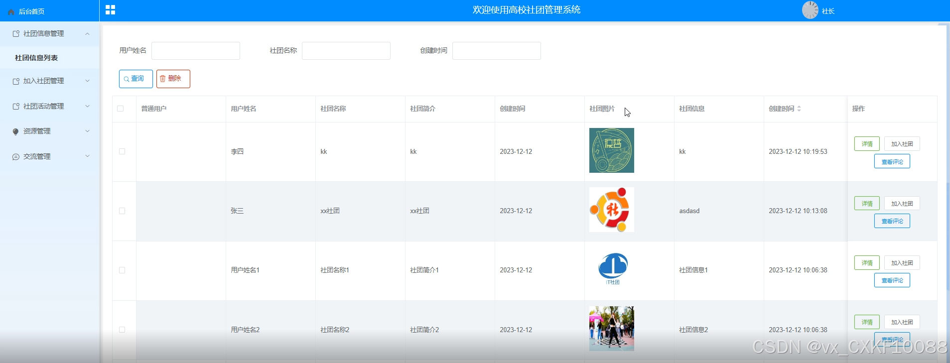 (1)社团信息:社长点击“社团信息”这一菜单,可以查看到社团信息的全部参数,也可以对社团信息进行查询或者删除,同时也可以查看前台用户对社团信息提交的评论。