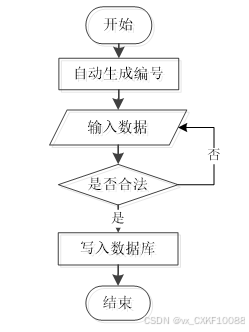 用户成功登入系统后就能够实现增加数据的操作,增加数据的编号是特定的,系统生成,用户不能随意填写,除了编号以外,其他增加信息用户自己填写,填写后的信息经过系统验证,验证合法通过就显示增加数据成功了,相反的话,就没有增加成功,图2-1显示的就是在增加数据时的流程。