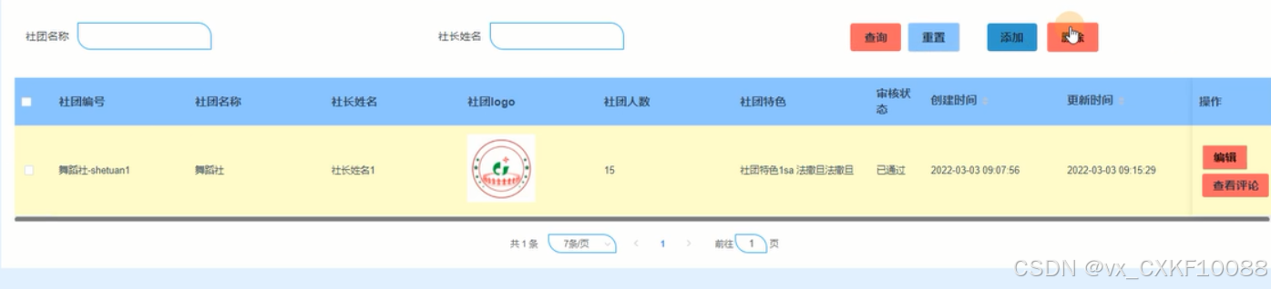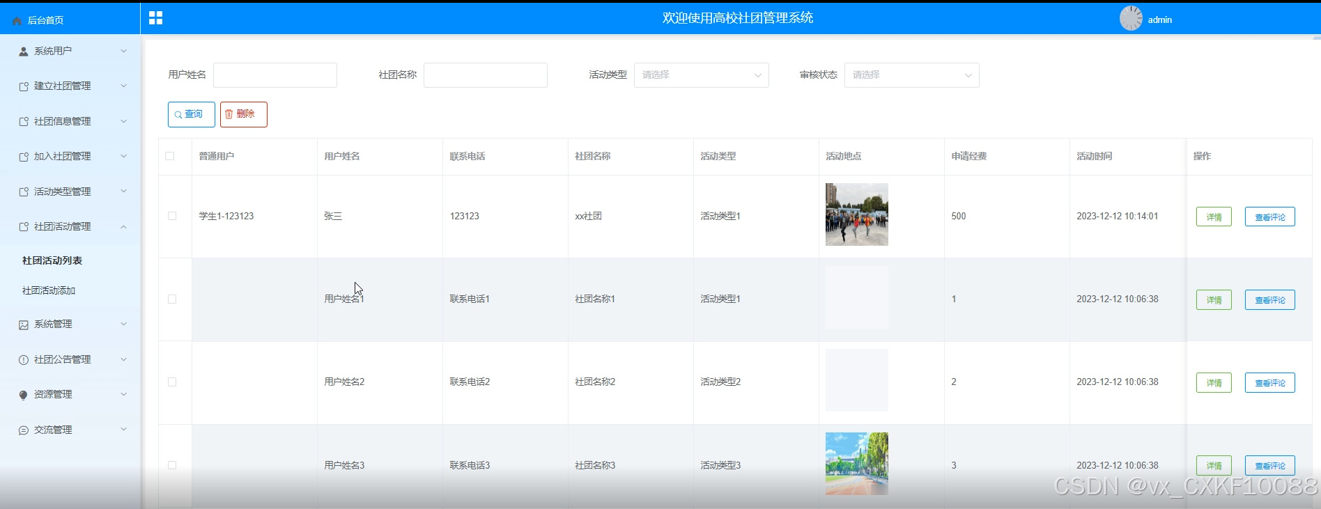 (7)社团活动:用户点击“社团活动”这个菜单按钮,就会显示所有的社团活动列表,在这个界面,也可以对社团活动进行增删改查操作。