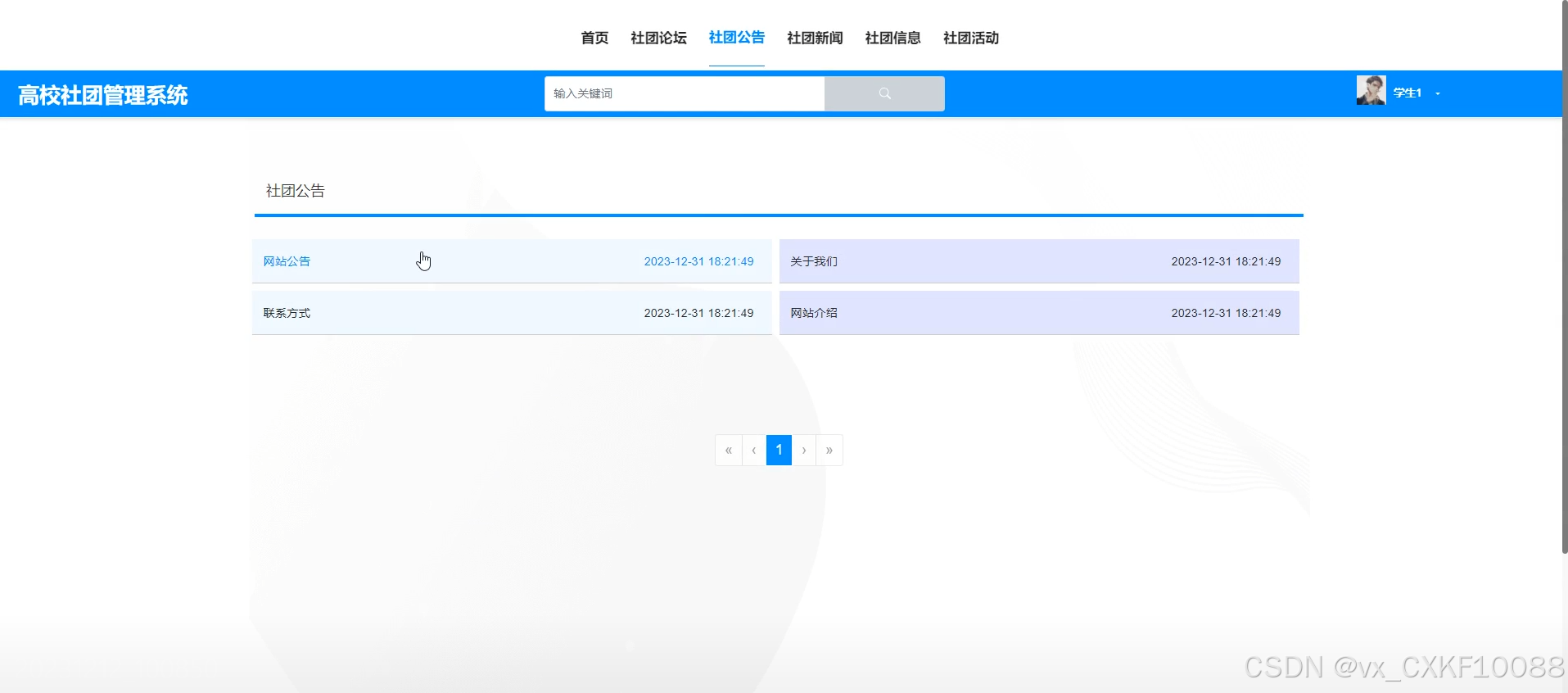 (8)社团公告管理:管理员可以对系统前台展示的社团公告进行增删改查,方便用户进行查看。