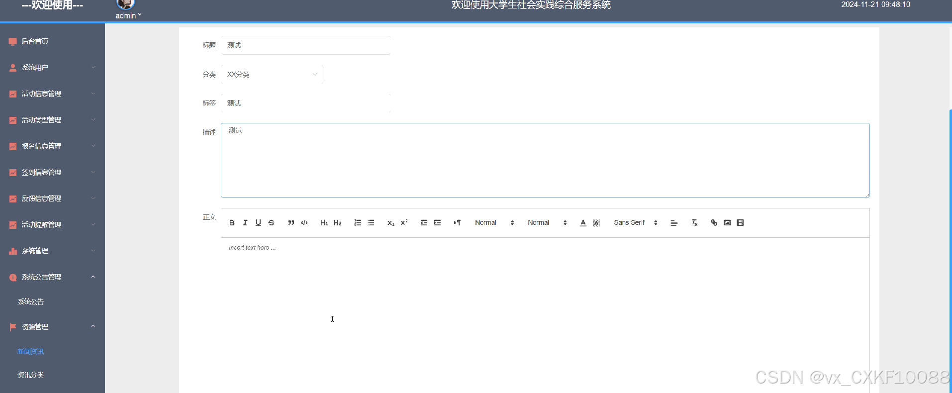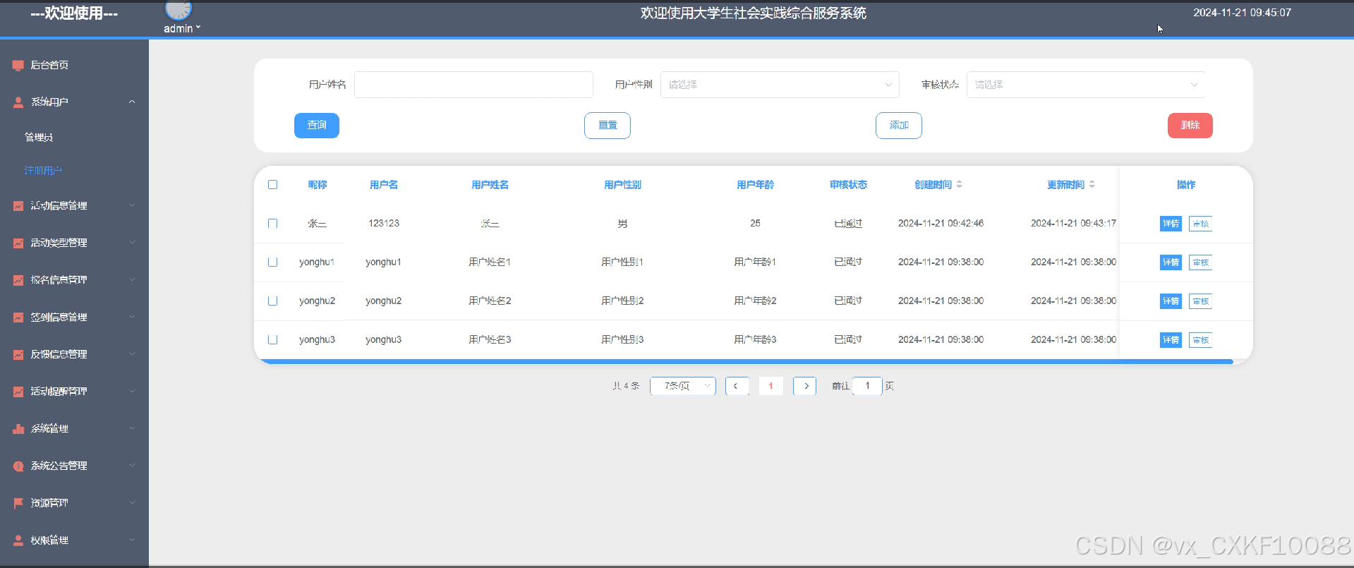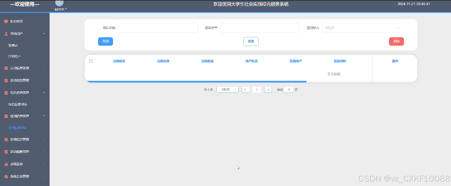 随着高等教育的深化和社会对人才需求的多样化,大学生的社会实践成为培养应用型、创新型人才的重要途径。然而,信息不对称、资源分散、管理效率低下等问题制约了社会实践的效果。因此开发一款Springboot大学生社会实践综合服务系统,旨在服务大学生以及管理员,系统实现包含多项关键功能,涵盖活动信息、报名信息、签到信息、活动提醒、反馈信息、系统公告等多个领域的管理与互动。通过使用Spring Boot技术框架,实现了快速开发和灵活部署的优势,以及MySQL数据库管理数据持久化与安全性,能够有效支持系统功能的实现与扩展。通过该技术,能够实现系统的快速迭代更新和稳定性维护,确保平台长期稳定运行。
