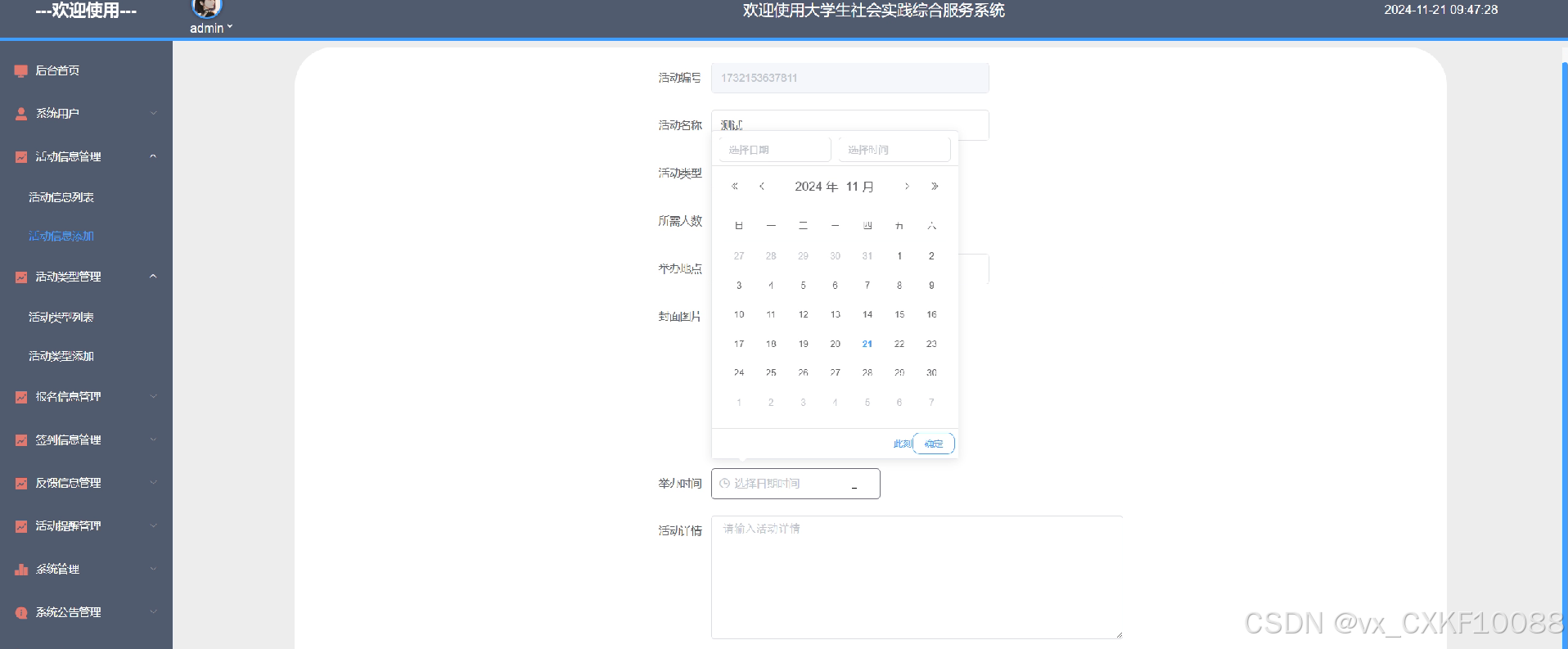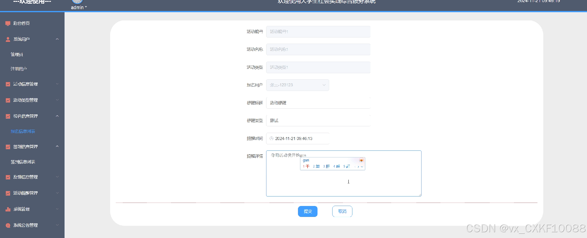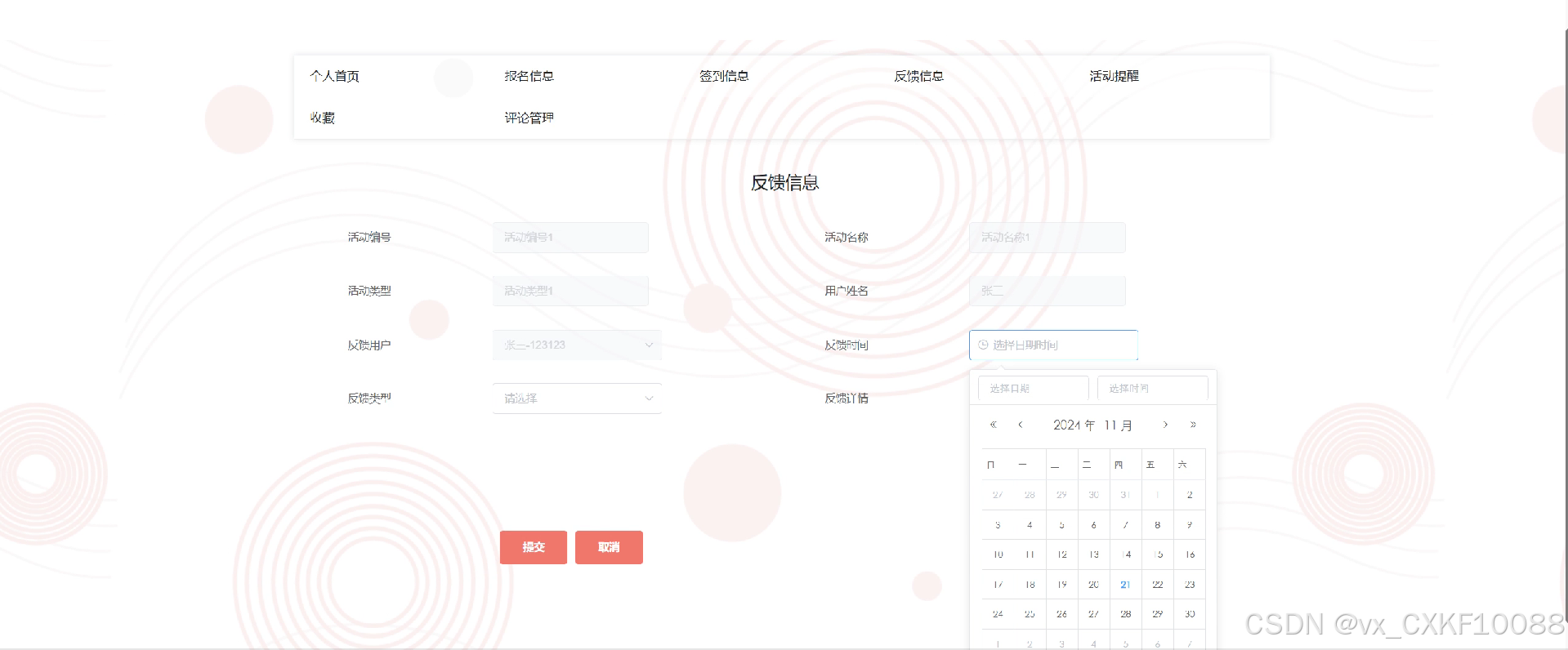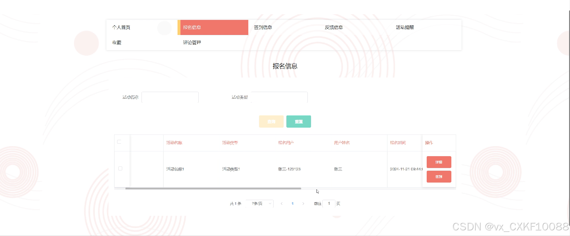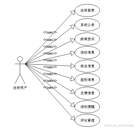 系统前端:系统前台用户主要包括首页、系统公告、新闻资讯、活动信息、报名信息、签到信息、反馈信息、活动提醒、评论管理等功能。