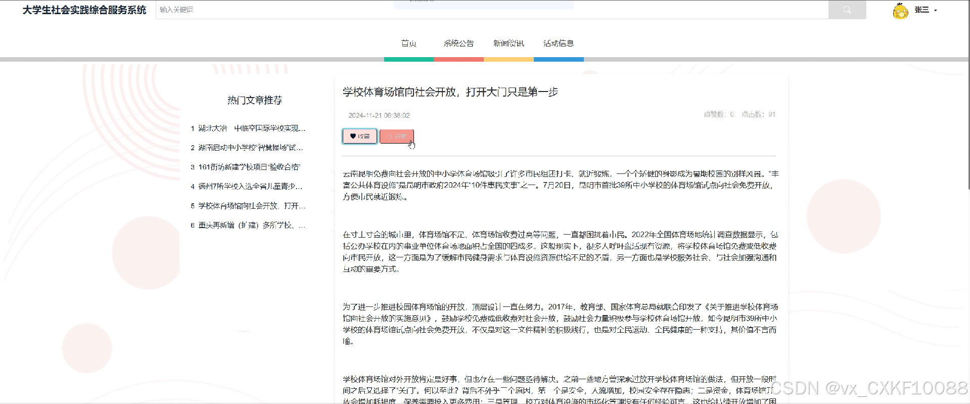 - 新闻资讯:普通用户可查看管理员发布的所有新闻资讯信息,支持搜索文章,可点击查看详情,可点赞、收藏和评论某一新闻资讯。