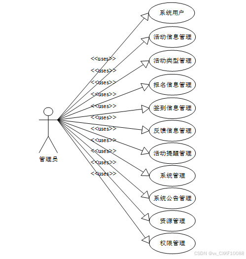 后台管理端:管理员可登录系统后台进行管理,拥有后台系统用户、活动信息管理、活动类型管理、报名信息管理、签到信息管理、反馈信息管理、活动提醒管理、系统管理、系统公告管理、资源管理以及权限管理等功能。